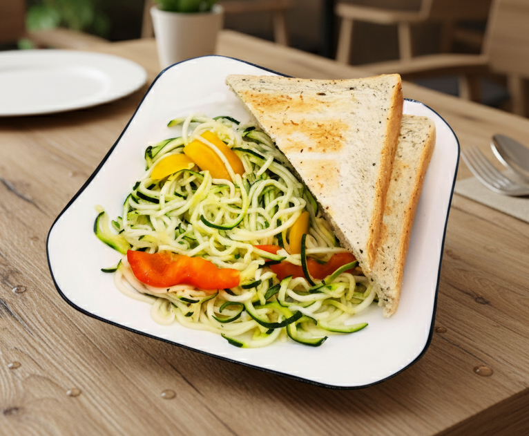 落兒逅叻谷的【櫛瓜條條麵】,以新鮮櫛瓜取代小麥麵條,口感清爽、滋味天然。搭配1片全麥厚土司,這不只是一份餐點,而是一份「安心」。我們堅持使用原型食物,所有烹調過程皆以橄欖油為基底,減少加工與不必要的油脂,保留食材最純粹的香氣與營養。